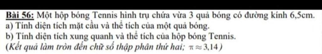 Thể tích của hộp bóng tennis là: `V=\pi·R^2·h=3,14·3,25^2·(3·6,5)=646,74 (cm^3)`