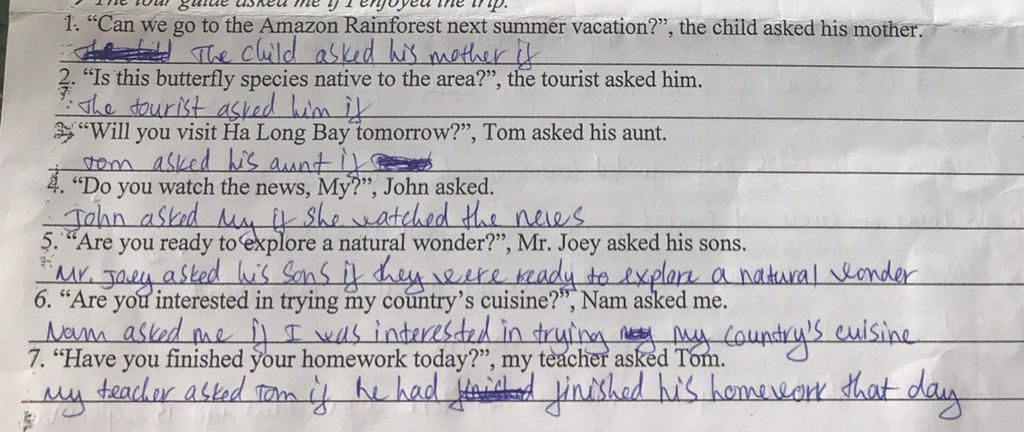 7, My teacher asked Tom if he had finished his homework that day.