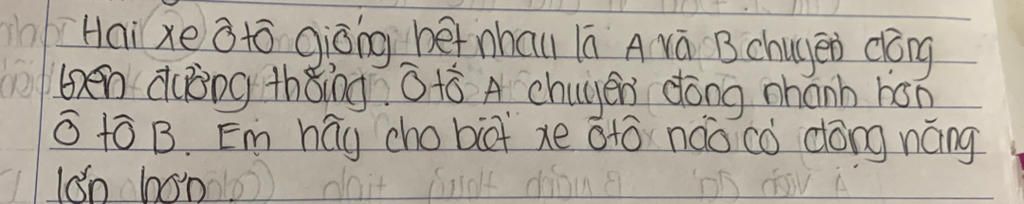 Khoa học tự nhiên (lý) hai xe oto giống nhau là a và b chuyển động trên đường thẳng . Oto a chuyển động nhanh hơn oto b .Em hãy chi biết xe oto nào có động năng lớn hơn