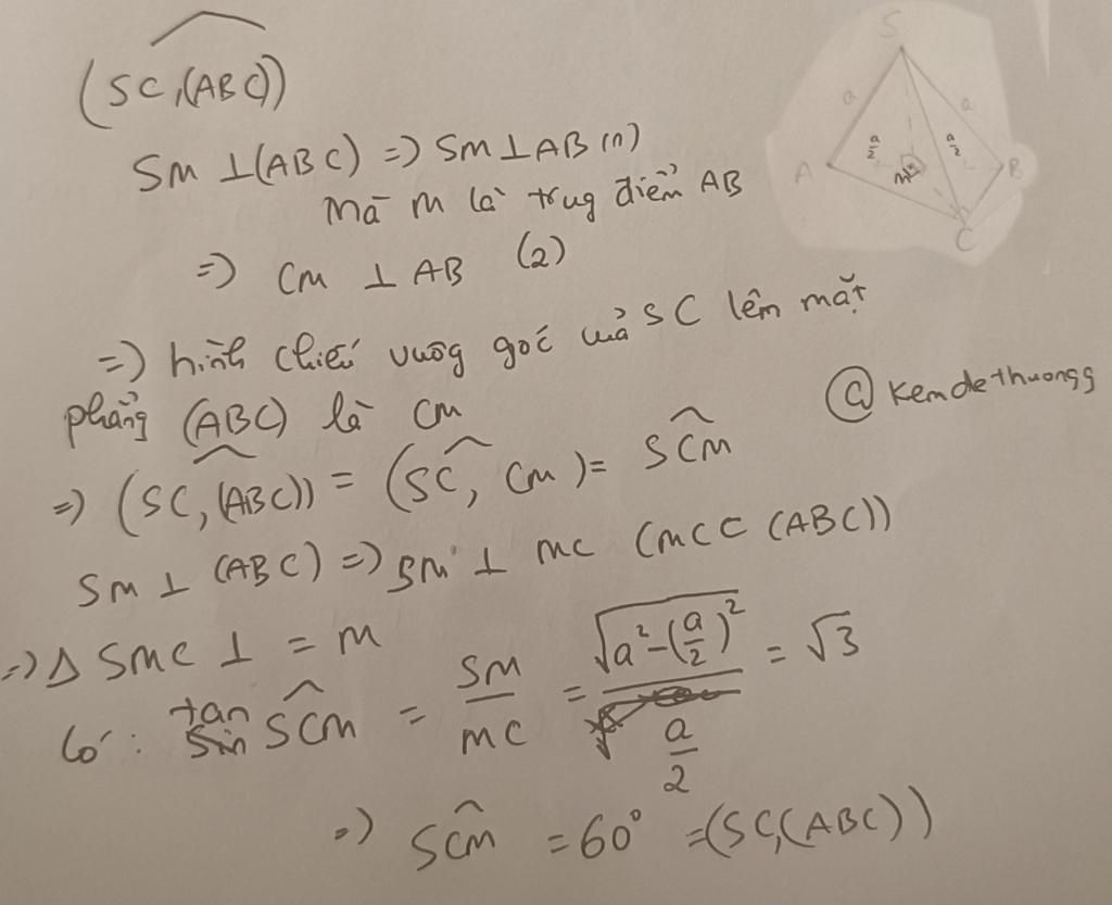 Hình 1 là lời giải của bài tập tìm góc nhị diện, đề là " Cho hình chóp S.ABC có đáy làm tam giác vuông tại C, mặt phẳng SAB là tam giác đều cạnh a, gọi M là trung điểm BC có SM vuông góc BC, tính góc giữa SC và mặt phẳng.