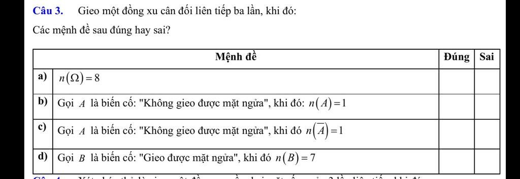 $d)$ Có `n(B)=n(\overline{A})=n(\Omega)-n(A)=8-1=7`