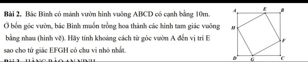 Mình sửa từ đoạn `HE^2=2x^2-20x+100` nhé `-> HE=\sqrt(2x^2-20x+100)` `-> HE=\sqrt(2(x^2-10x+25)+50)` `-> HE=\sqrt(2(x-5)^2+50)` `P_(HEFG)=4HE=4\sqrt(2(x-5)^2+50)` Có `(x-5)^2>=0AAx\inRR` `-> 2(x-5)^2+5)>=50` `-> P_(HEFG)=4\sqrt(2(x-5)^2+50)>=4\sqrt(50)=20\sqrt(2)` Dấu "`=`" xảy ra khi` x-5=0` Vậy `minP=20\sqrt(2)` khi `x=5` Rút gọnMình sửa từ đoạn `HE^2=2x^2-20x+100` nhé `-> HE=\sqrt(2x^2-20x+100)` `-> HE=\sqrt(2(x^2-10x+25)+50)` `-> HE=\sqrt(2(x-5)^2+50)` `P_(HEFG)=4HE=4\sqrt(2(x-5)^2+50)` Có `(x-5)^2>=0AAx\inRR` `-> 2(x-5)^2+5)>=50` `-> P_(HEFG)=4\sqrt(2(x-5)^2+50)>=4\sqrt(50)... xem thêm