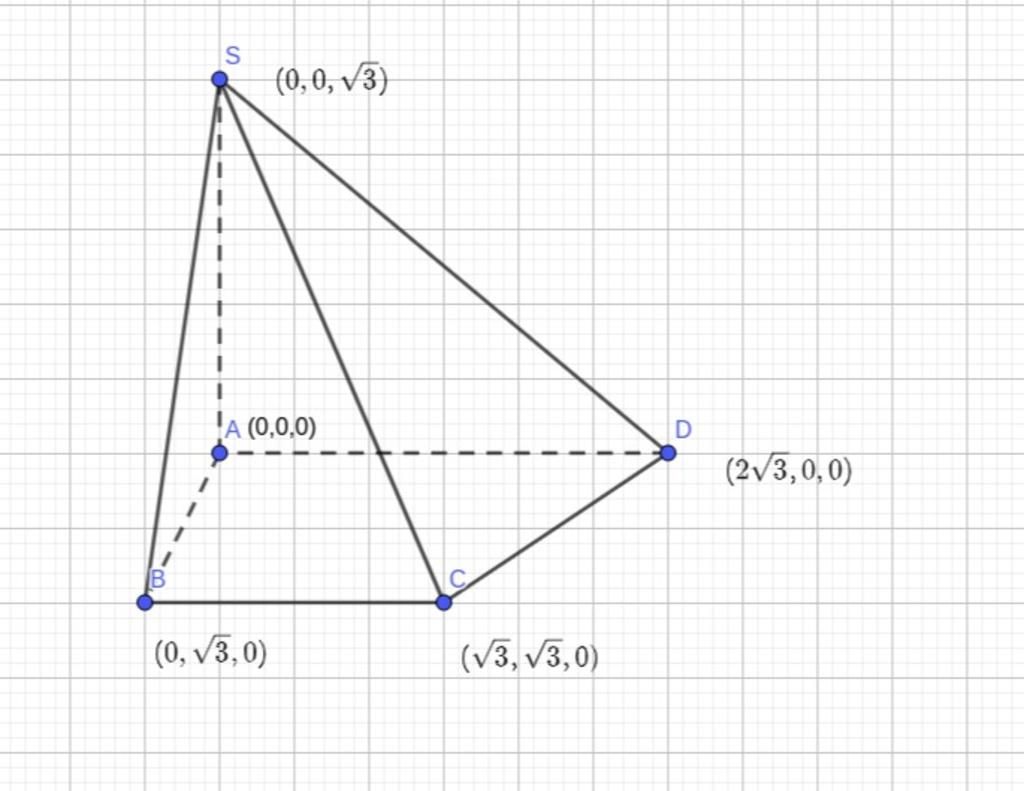cho hình chóp sabcd có đáy là hình thang vuông tại a và b , ab=bc=căn 3 , ad=2 căn 3 . sa vuông góc với mặt đáy và sa=căn 3 . khoảng cách giữa sb và cd bằng bao nhiêu