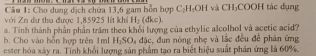 Câu 1: Cho dung dịch chứa 13,6 gam hỗn hợp C,H,OH và CH3COOH tác dụng