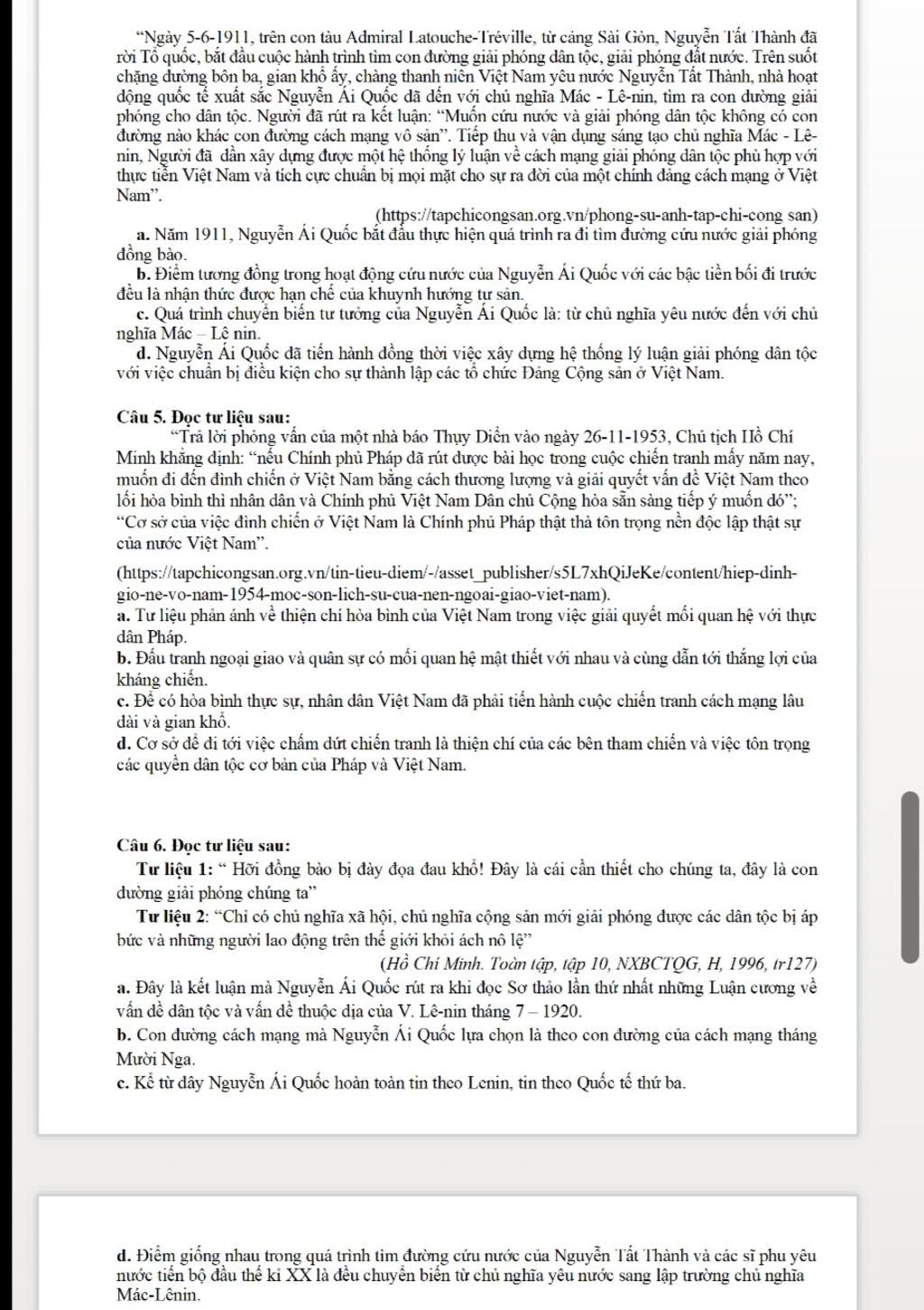 a. Đúng → Tư liệu phản ánh về thiện chí hòa bình của Việt Nam trong việc giải quyết mối quan hệ với thực dân Pháp. Chủ tịch Hồ Chí Minh khẳng định sẵn sàng đàm phán và thương lượng để giải quyết vấn đề Việt Nam bằng con đường hòa bình với điều kiện Pháp phải tôn trọng độc lập thật sự của Việt Nam.