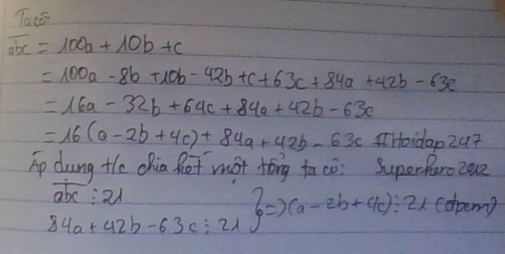 `{:(\overline{abc} \vdots 21),(84a+42b-63c \vdots 21):}} => (a-2b+4c) \vdots 21`