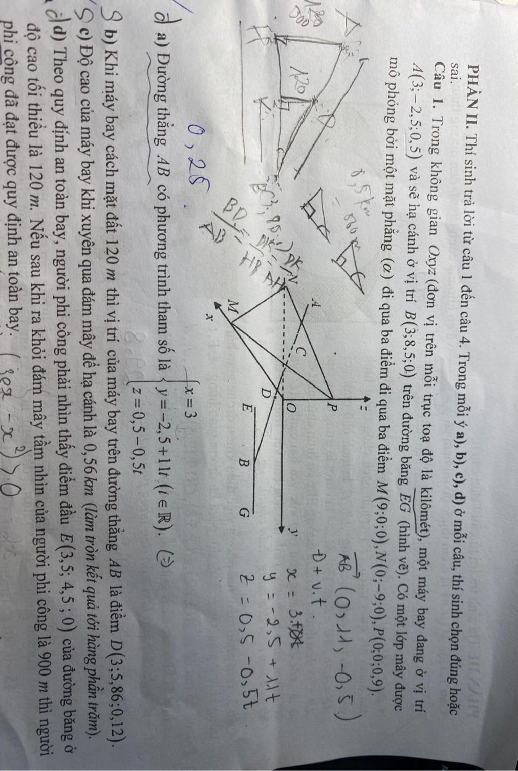 Câu 1. Trong không gian Oxyz (đơn vị trên mỗi trục toạ độ là kilômét), một máy bay đang ở vị trí 4(3;- 2,5;0,5) và sẽ hạ cánh ở vị trí B (3;8,5;0) trên đường băng EG (hình vẽ). Có một lớp mây được mô phỏng bởi một mặt phẳng (a) đi qua ba điểm đi qua ba điểm M (9;0;0), N (0;-9;0), P(0;0;0,9).