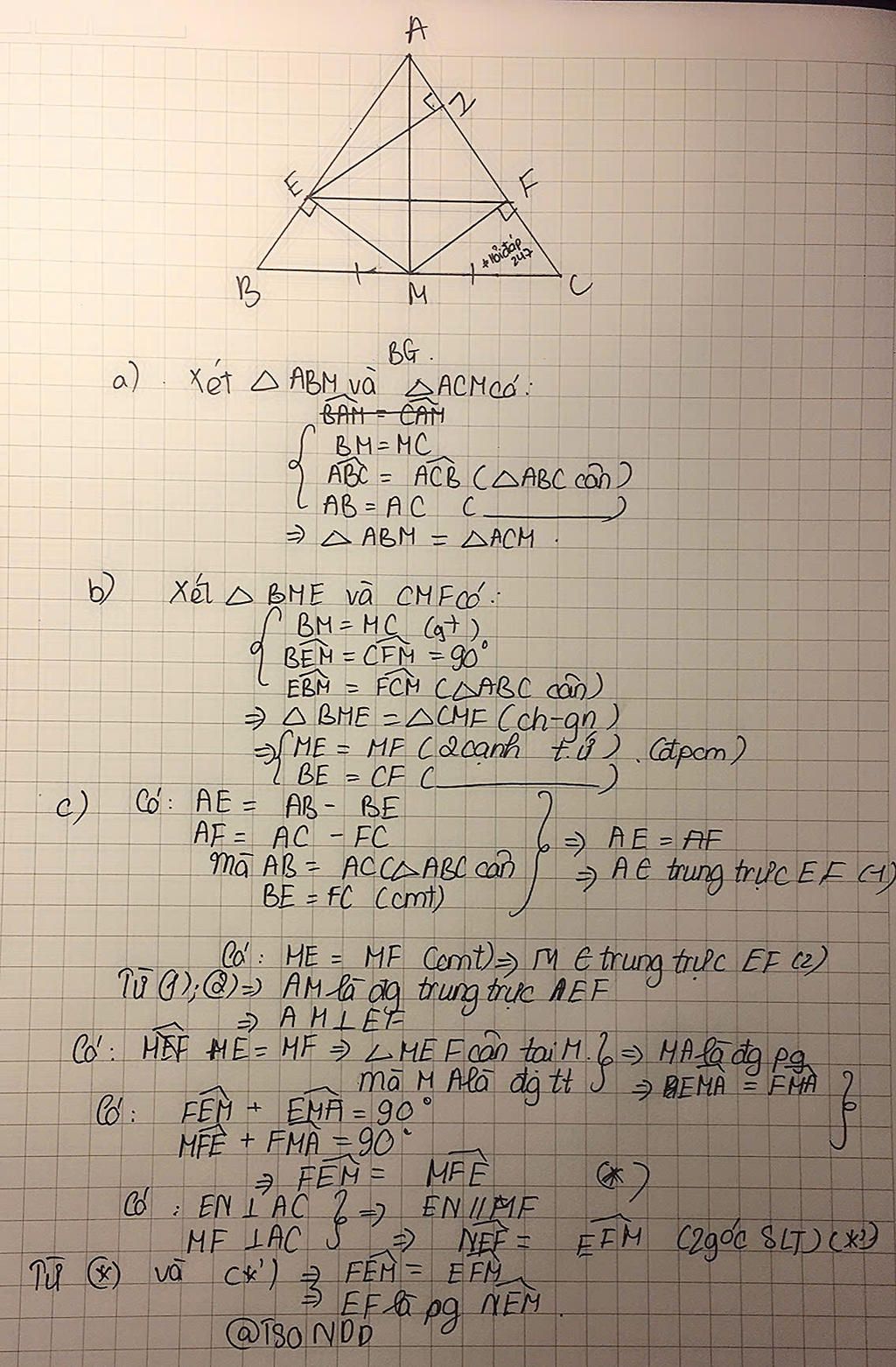 c) Kẻ EN vuông góc AC. Chứng minh EF là phân giác của góc MEN.
