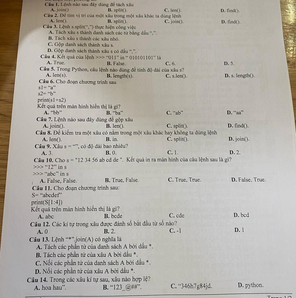 Câu 1. Lệnh nào sau đây dùng để tách xâu