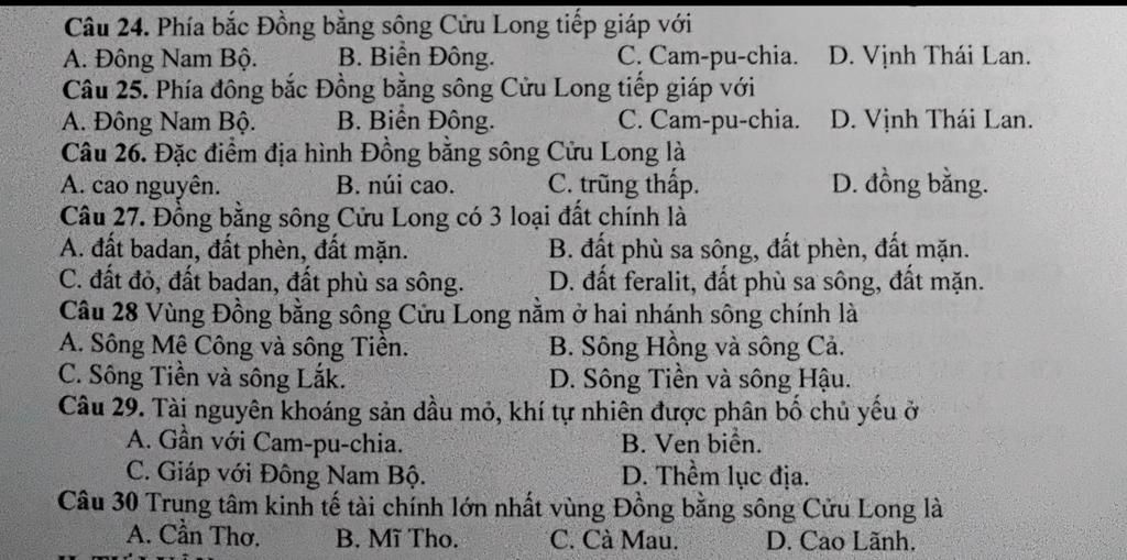 Câu 27: Đáp án B. đất phù sa sông, đất phèn, đất mặn