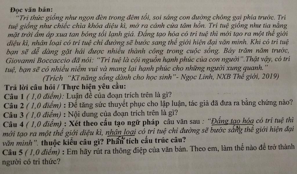 - Văn bản nhấn mạnh tầm quan trọng của tri thức và trí tuệ trong cuộc sống của con người. Tri thức được ví như ngọn đèn soi sáng con đường, chìa khóa mở cửa tâm hồn, và ánh nắng xua tan bóng tối