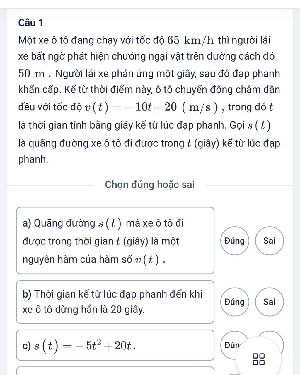 50 m . Người lái xe phản ứng một giây, sau đó đạp phanh