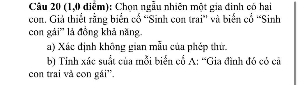 Không gian mẫu là : `\text{ trai trai ; gái gái ; trai gái ; gái trai } `