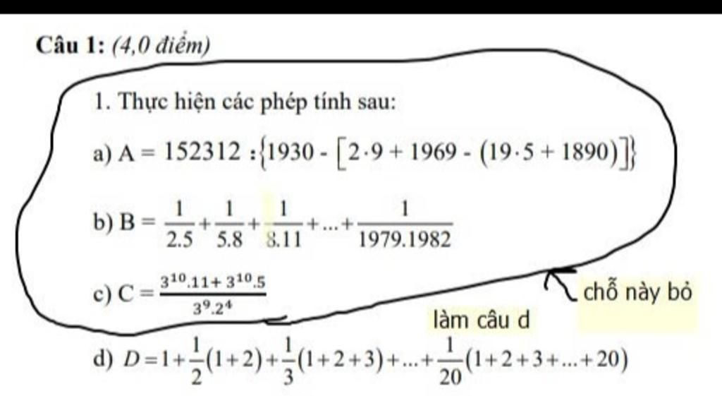 d) Ta có: D= 1 + $\frac{1}{2}$($\frac{2.3}{2}$) + $\frac{1}{3}$($\frac{3.4}{2}$) ....... + $\frac{1}{20}$( $\frac{20.21}{2}$)