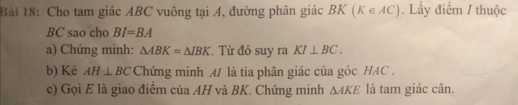 Bài 18: Cho tam giác ABC vuông tại A, đường phân giác BK (K ∈ AC). Lấy điểm I thuộc