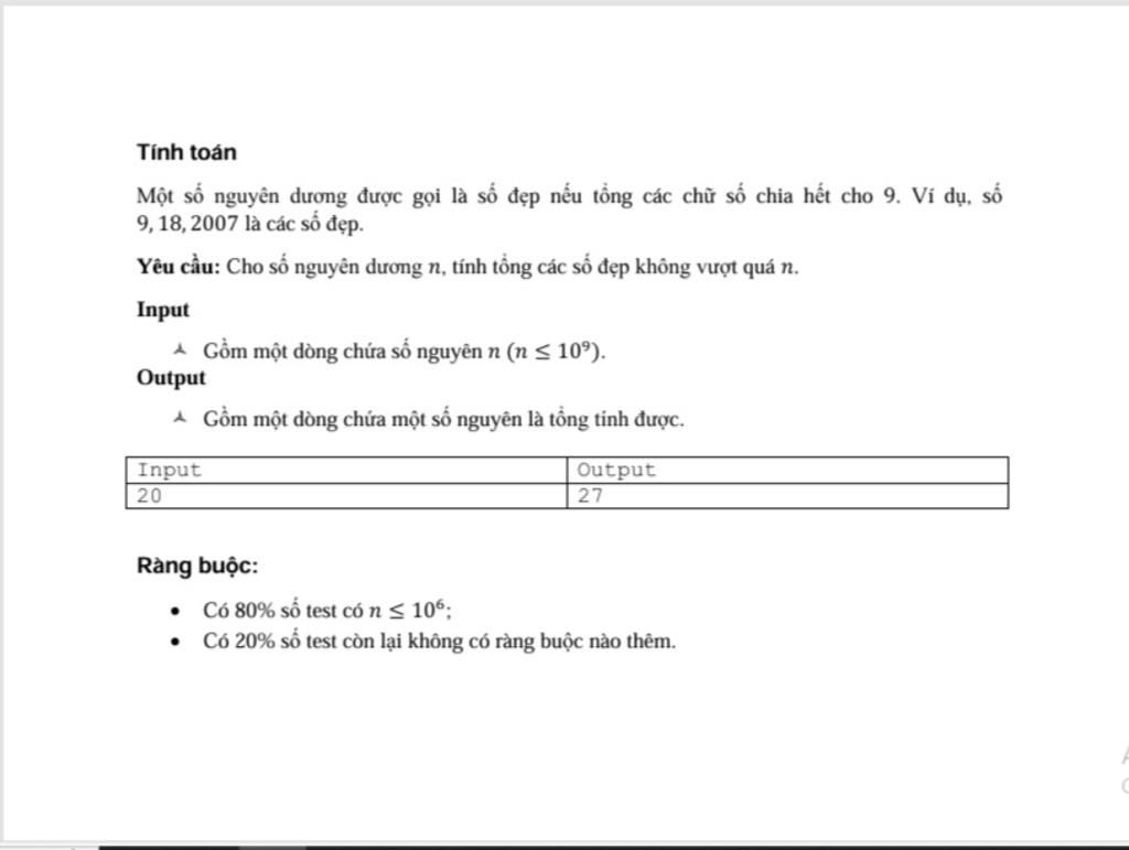 Ngắn hơn: n=int(input()) tong=0 for i in range (8,n+1): if i%9==0: tong+=i print(tong) Do số nào có tổng các chữ số chia hết cho 9 thì số đó cũng chia hết cho 9