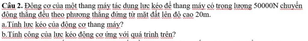 【Câu trả lời】: a. Lực kéo của động cơ thang máy là 50000 N.