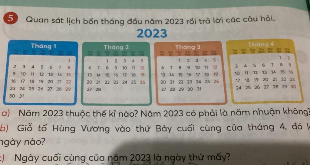 c) Ngày cuối cùng của năm 2023 là ngày thứ mấy? Ko cần nhìn lịch thôi,suy nghĩ kĩ giải đi và cũng giải thích nha quan sát bốn tháng đầu năm 2023 ở ảnh trước khi trả lời