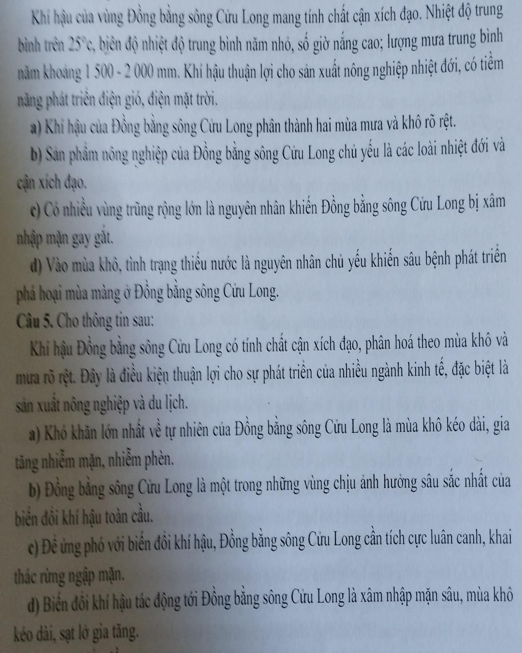 b. Đúng → Đồng bằng sông Cửu Long là một trong những vùng chịu ảnh hưởng sâu sắc của biến đổi khí hậu với các hiện tượng như xâm nhập mặn gia tăng, mùa khô kéo dài và sạt lở đất.