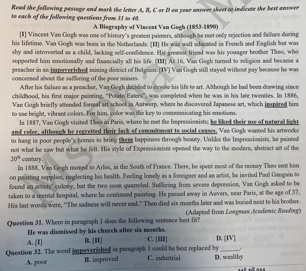 Dẫn chứng: Câu underlined: Van Gogh thích cách dùng ánh sáng tự nhiên và màu sắc của Impressionists, nhưng tiếc vì họ thiếu cam kết với các vấn đề xã hội (tức ngưỡng mộ nhưng cũng phê phán)
