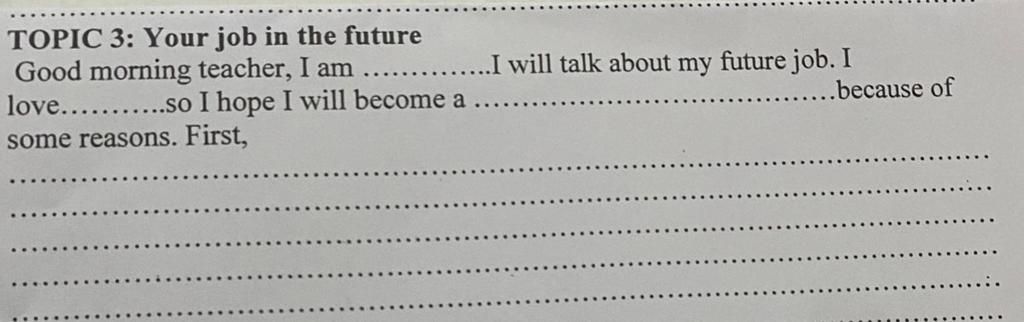 I love children very much, so I hope I will become a teacher in the future. I want to help students learn new things and grow up to be good people. Being a teacher is a meaningful job because I can share knowledge and inspire others. I will study hard and learn many teaching skills to become a good teacher. In the future, I want to teach at a good school and help many students succeed. I believe that with passion and effort, I can do this job well and make a difference. Thank you for listening.