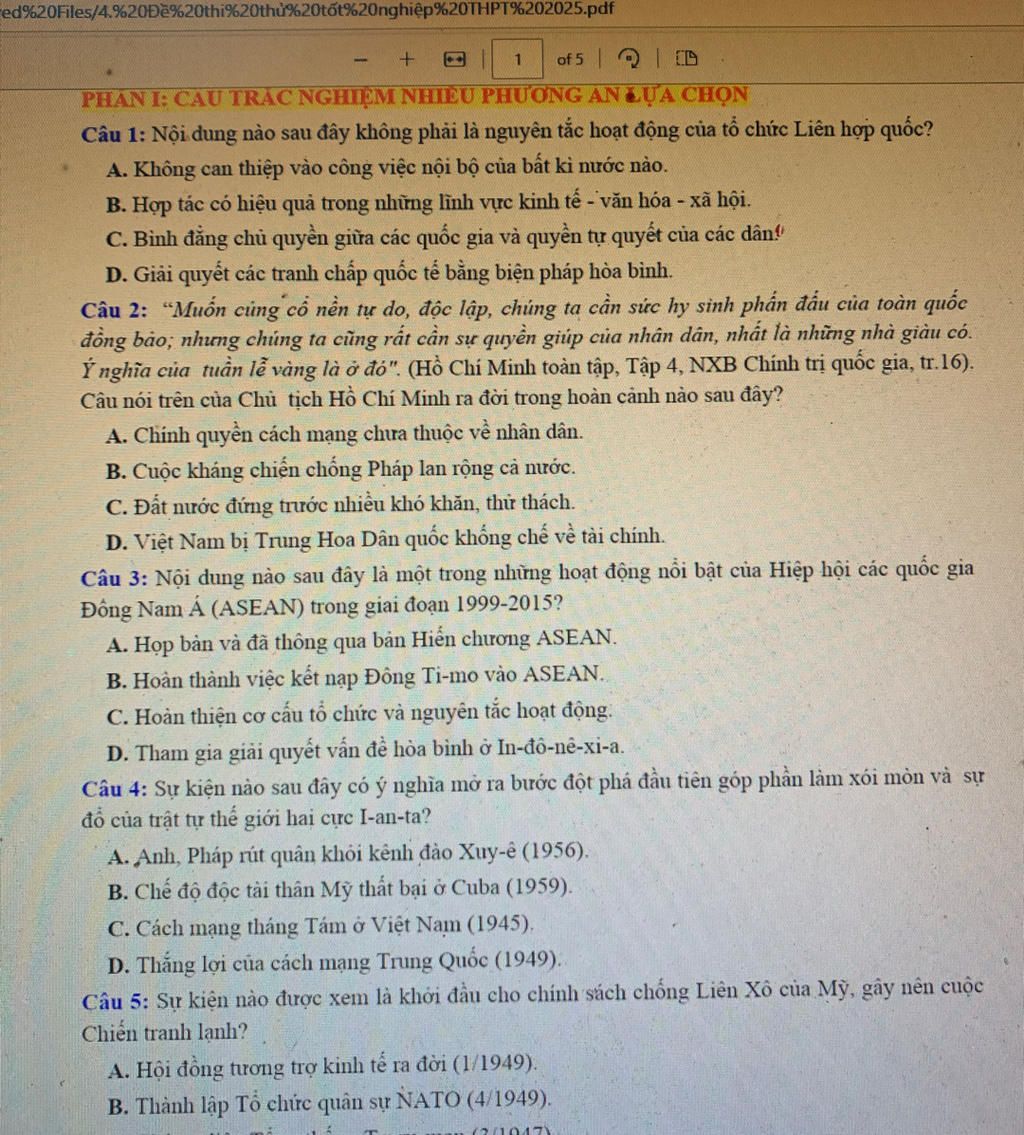 1. B → Nguyên tắc hoạt động của Liên hợp quốc bao gồm bình đẳng chủ quyền giữa các quốc gia, giải quyết tranh chấp bằng biện pháp hòa bình và không can thiệp vào công việc nội bộ của các nước khác. Tuy nhiên, hợp tác có hiệu quả trong những lĩnh vực kinh tế - văn hóa - xã hội là mục tiêu hoạt động chứ không phải nguyên tắc hoạt động của tổ chức này.