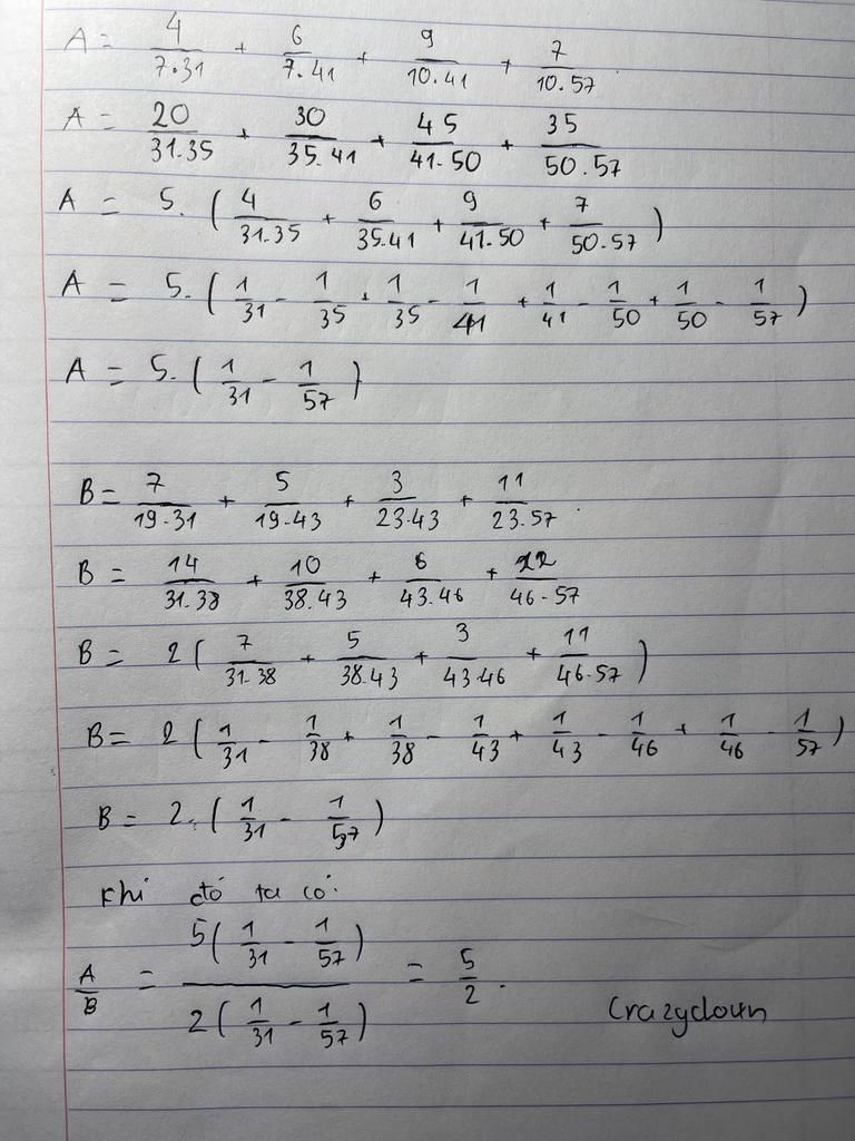 Cho `A = 4/(7.31) + 6/(7.41) + 9/(10.41) + 7/(10.57)` và `B= 7/(19.31) + 5/(19.43) + 3/(23.43) + 11/(23.57)` . Tính tỉ số `A:B`