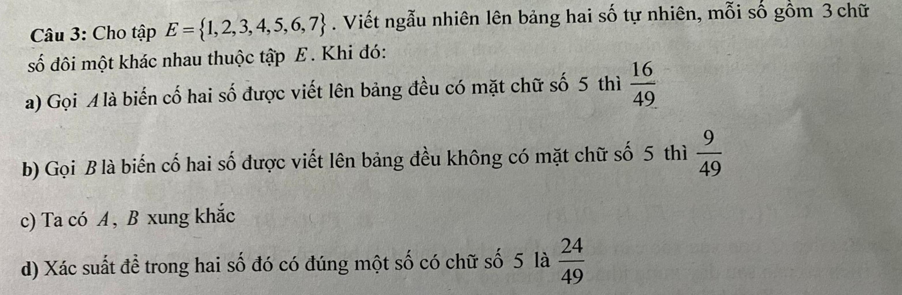 Câu 3: Cho tập E={1,2,3,4,5,6,7} . Viết ngẫu nhiên lên bảng hai số tự nhiên, mỗi số gồm 3 chữ