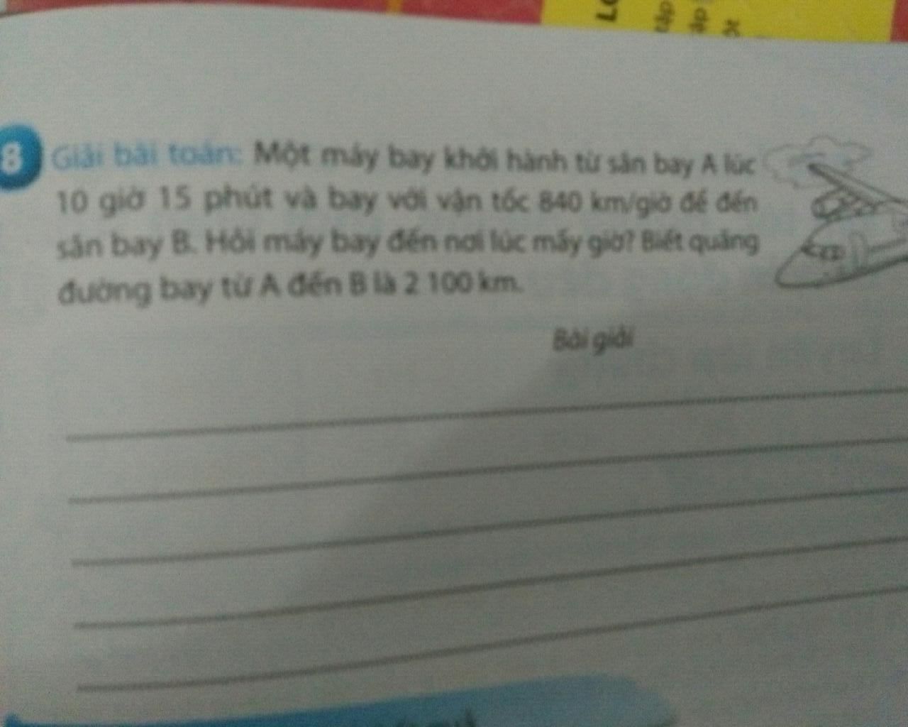 $\text{vậy máy bay đến lúc 2 giờ 30 phú +10 giờ 15 phút=12 giờ 45 phút}$