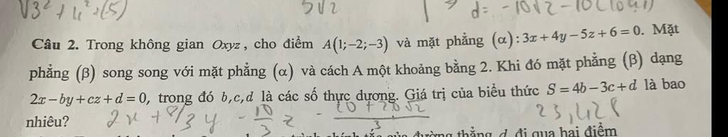 Câu 2. Trong không gian Oxyz, cho điểm A(1;-2;-3) và mặt phẳng (a):3z+4y-5z+6=0. Mặt