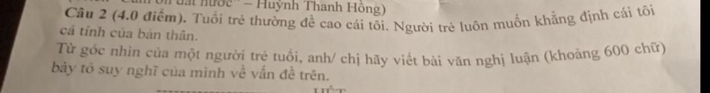 Câu 2 tuổi trẻ thường đề cao cái tôi người trẻ luôn muốn khẳng định cái tôi cá tính của bản thân từ góc nhìn của một số người trẻ anh chị hãy viết bài văn nghị luận khoảng 600 chữ bày tỏ suy nghĩ của mình về vấn đề trên