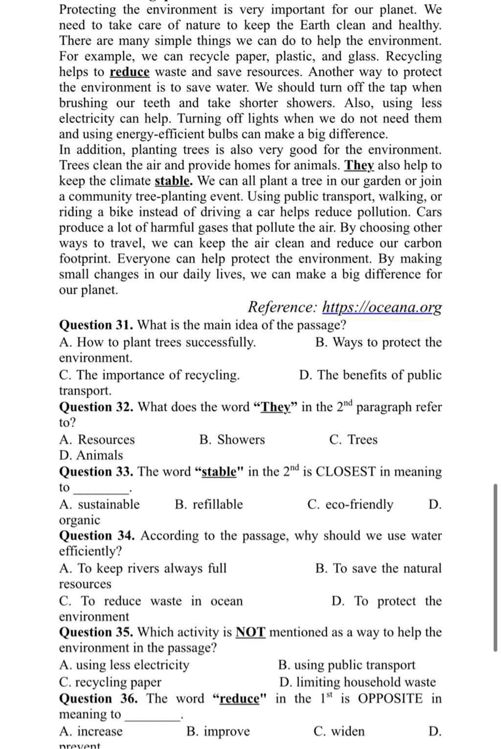 → Sau đó, toàn bài liệt kê rất nhiều cách để bảo vệ môi trường như: tái chế, tiết kiệm nước, trồng cây, đi xe công cộng,…