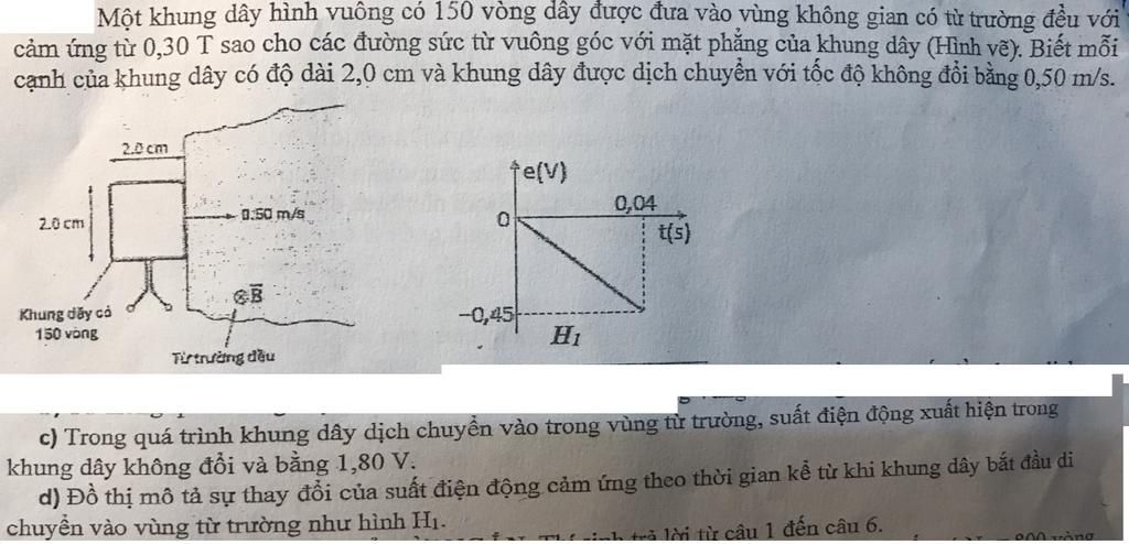 Trong quá trình dịch chuyển khung vào (trong `0,04s` đầu tiên) thì suất điện động trong khung có độ lớn là `0,45V` là không đổi nên đồ thị có dạng đường thẳng song song với trục thời gian.