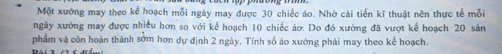 Trên thực tế, số áo may mỗi ngày: `(x+20)/(30+10) =(x+20)/40` (chiếc áo)