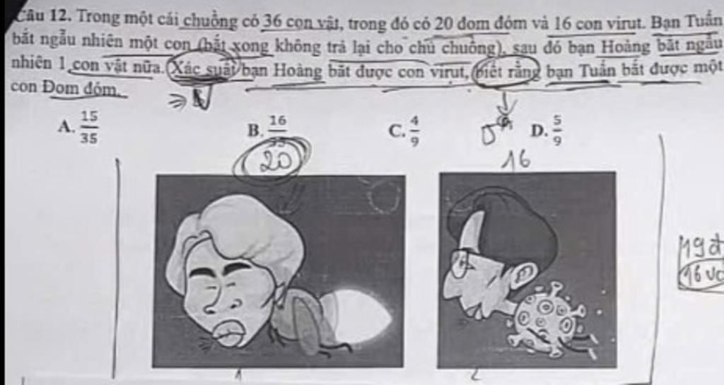 Câu 12. Trong một cái chuồng có 36 con vật, trong đó có 20 đom đóm và 16 con virut. Bạn Tuần