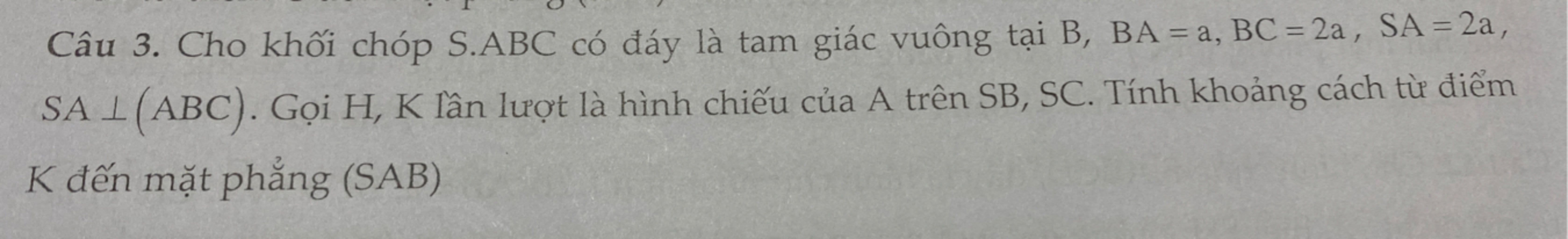 Câu 3. Cho khối chóp S.ABC có đáy là tam giác vuông tại B, BA=a,BC=2a, SA=2a,