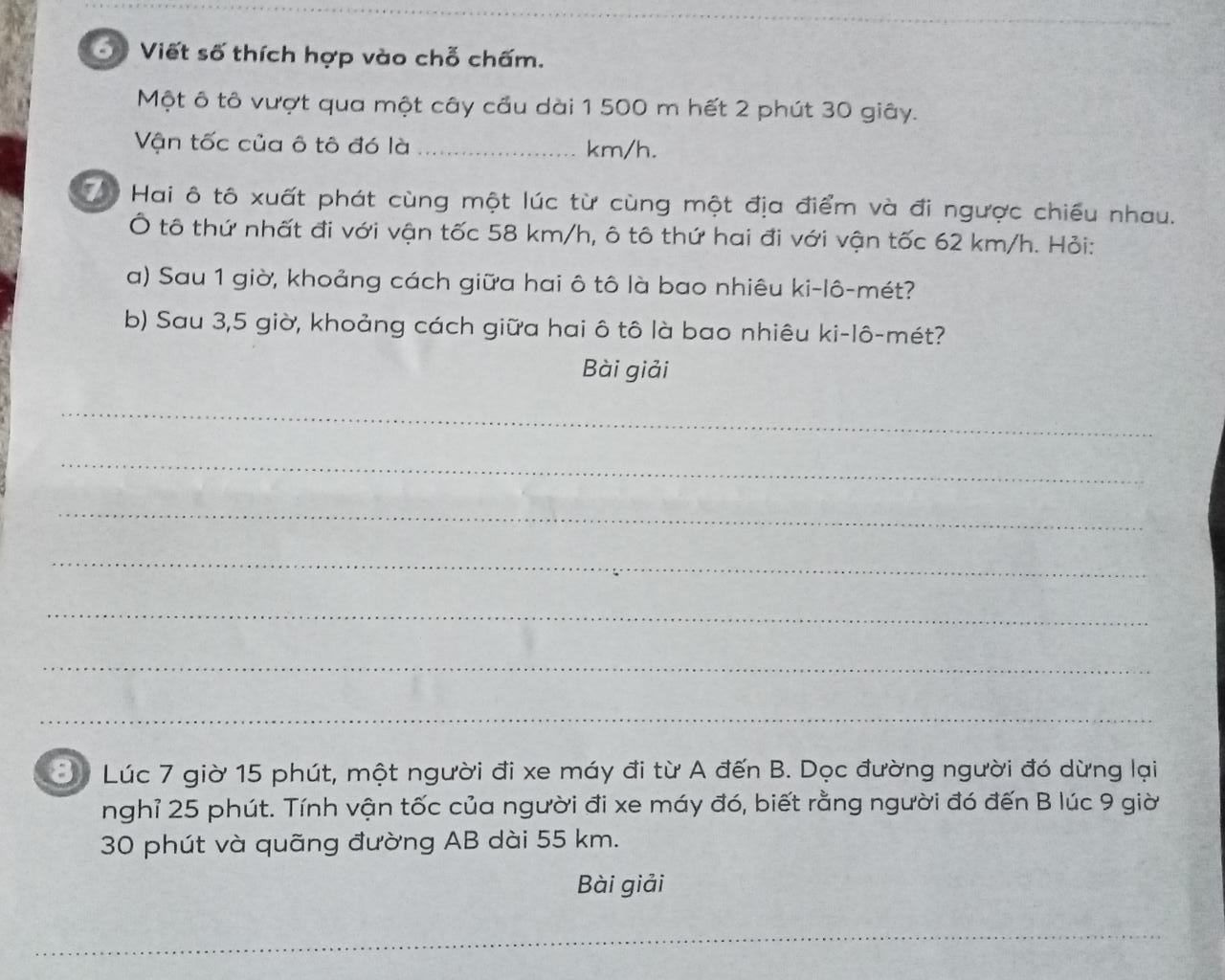 $$\text{9 giờ 30 phút - 7 giờ 15 phút - 25 phút = 1 giờ 50 phút = $\dfrac{11}8$ giờ}$$