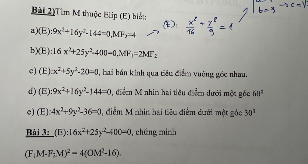 d) (E):9x2+16y2-144=0, điểm M nhìn hai tiêu điểm dưới một góc 600.