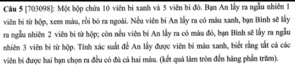 Câu 5 (703098]: Một hộp chứa 10 viên bi xanh và 5 viên bị đỏ. Bạn An lấy ra ngẫu nhiên 1