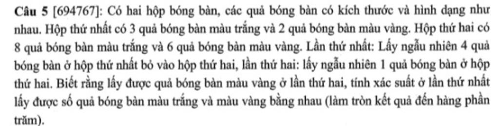 Câu 5 [694767]: Có hai hộp bóng bàn, các quả bóng bàn có kích thước và hình dạng như