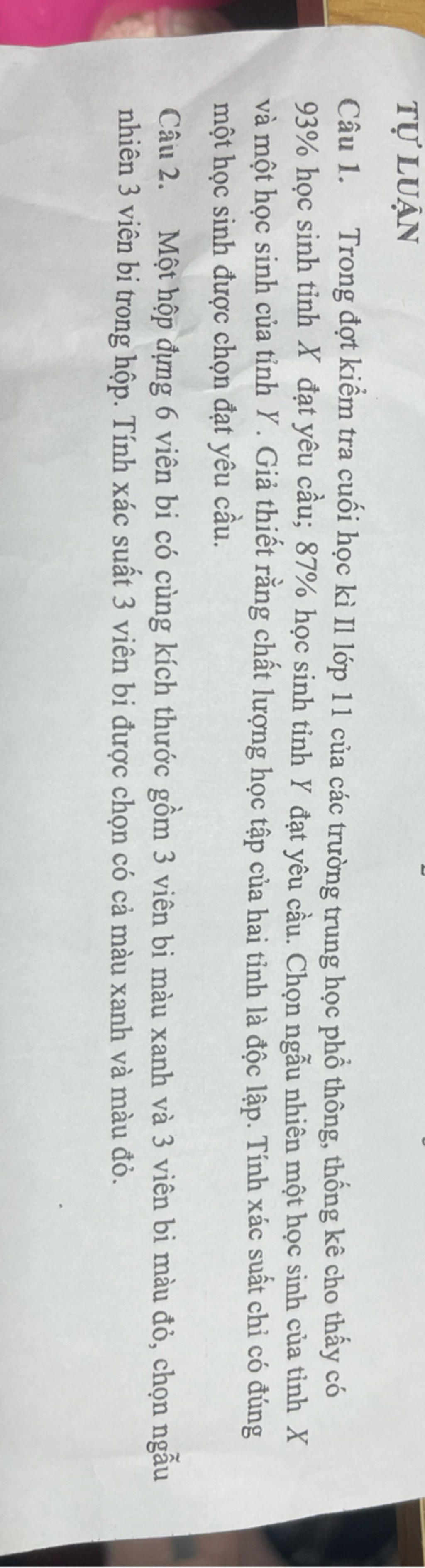 Câu 1. Trong đợt kiểm tra cuối học kì II lớp 11 của các trường trung học phổ thông, thống kê cho thấy có