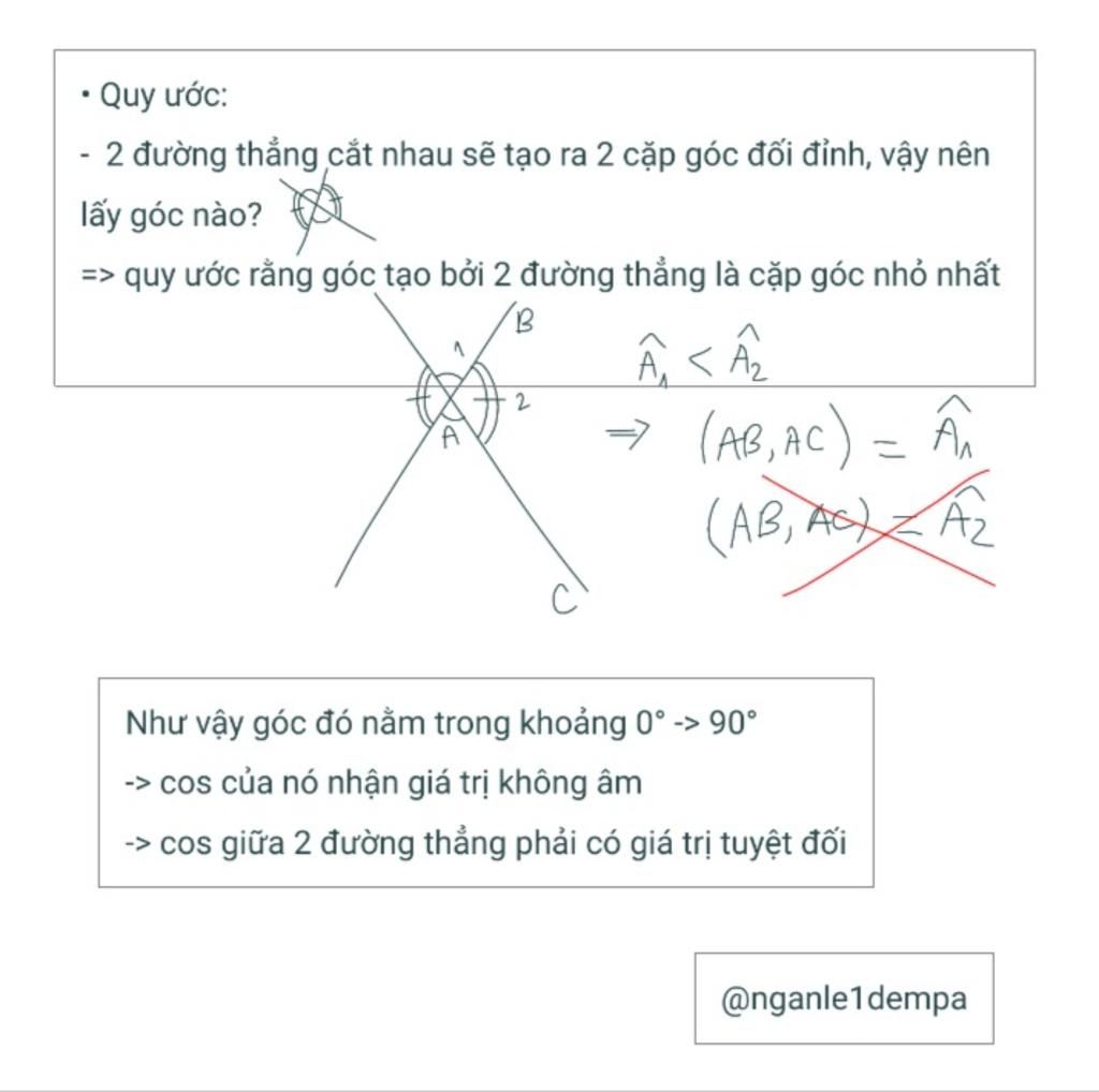Cosin của góc giữa hai vector không cần trị tuyệt đối vì góc giữa hai vector được xác định trong khoảng từ 0 đến pi (180 độ). Điều này có nghĩa là cosin luôn có giá trị dương hoặc âm, phản ánh hướng của góc. Trong khi đó, khi tính góc giữa hai đường thẳng, chúng ta quan tâm đến góc nhỏ hơn (từ 0 đến 90 độ), do đó cần trị tuyệt đối để đảm bảo kết quả dương và thể hiện góc nhỏ nhất giữa hai đường thẳng.
