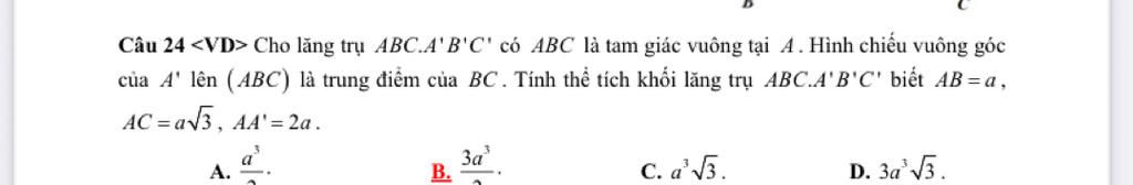 `=>V_{ABC.A'B'C'}=S_(ΔABC).A'H=1/2 a\sqrt{3}.a.a\sqrt{3}=(3a³)/2`