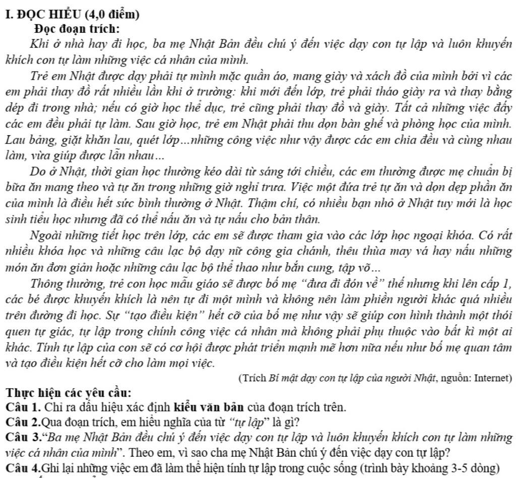 `-` Cha mẹ Nhật Bản chú ý đến việc dạy con tự lập vì họ muốn con cái trưởng thành, sống tự tin, có trách nhiệm và làm chủ cuộc sống của mình trong tương lai.
