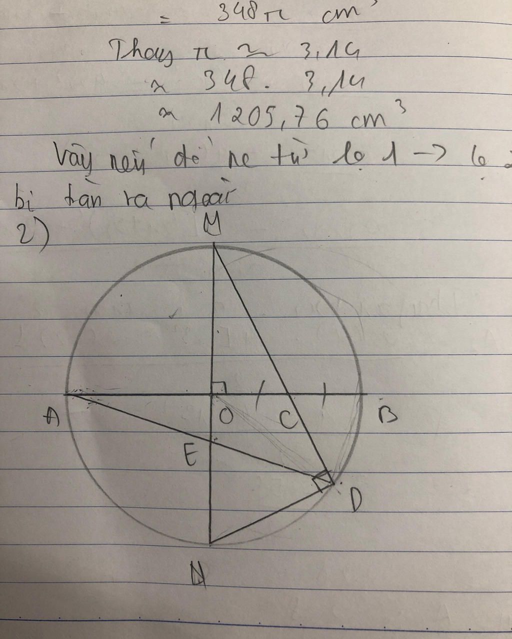 Cho đường tròn tâm O bán kính r có hai đường kính AB và MN vuông góc tại O. Gọi C trung điểm của OB, tia MC cắt đường tròn tâm O tại D. Gọi E là giao điểm của AD và MN. Chứng minh AD.AE = 2R^2 ; OA= 3OE