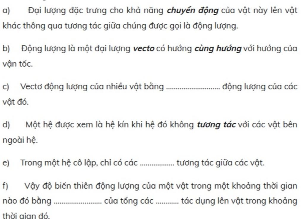 `-` Nội lực là các lực tương tác giữa các vật trong cùng một hệ. Trong 1 hệ cô lập, vì không có lực nào từ bên ngoài tác dụng vào hệ `=>` chỉ có nội lực gây ra sự thay đổi động lượng của từng vật trong hệ.