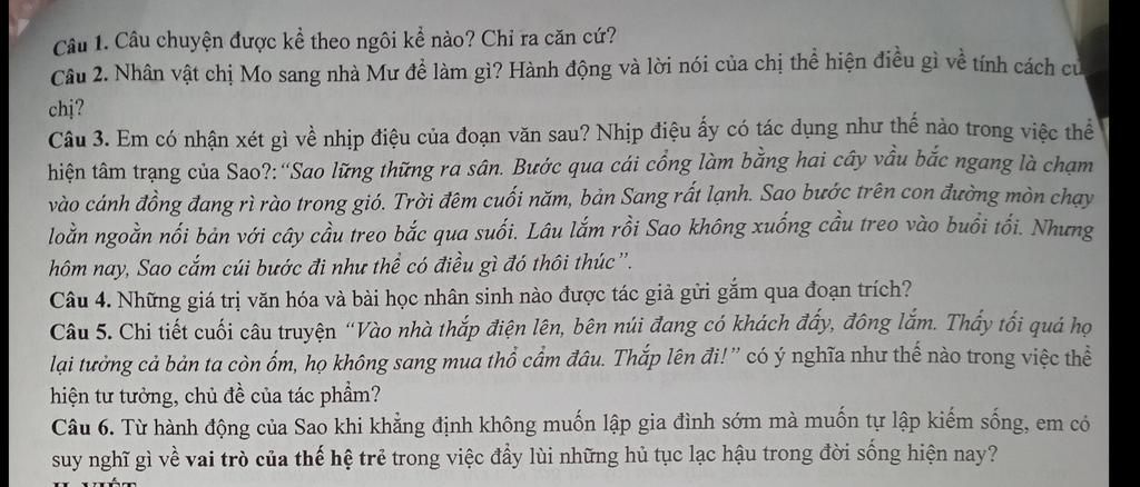 Thằng Cu vội vàng đứng dậy chạy vào nhà bật cái bỏng điện gần phía cửa. Con Sao đi vào bếp lấy thêm một cái bắt và một đôi đùa. Mư đứng dậy cầm tay chị gải kéo chị ngồi xuống ghế, bên mâm cơm chỉ có duy nhất một bát canh măng nấu chua và đĩa cà xanh xào ớt làm thức ăn (...). Mo chậm rãi nói. Chỉ sang đây là vì chuyện cháu Chơn. Nếu không vì chờ đợi con bé Sao đến lúc đủ tuổi thì anh chị cũng đã cưới vợ cho nó từ hai năm trước rồi. Nhà thì quả nhiều việc, anh chị đều bị đau lưng, nên cũng không chờ thêm được nữa. Chỉ muốn cười dâu về để đỡ đần việc nhà. Thằng Chơn năm nay hai mươi mốt, cứng cáp rồi. Chị nói trước thể để các em thu xếp cho cái khoản anh chị đã giúp, để còn lo việc cho chảu vào Tết này. Nói xong chỉ Mo đứng dậy, nhanh chóng rời đi không để vợ chồng người em gái thanh minh hay khất nợ câu nào.