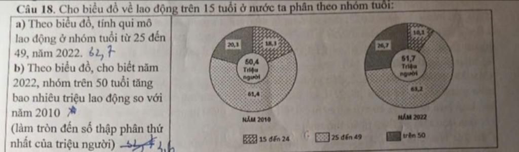 `a)` Quy mô lao đồng ở nhóm tuổi từ `25` tuổi đến `49` tuổi năm `2022`:$\\$ `(51,7xx63,2)/100=32,7(`triệu người`)`$\\$ `b)` Số lao động ở nhóm trên `50` tuổi năm `2022` so với năm `2010` tăng:$\\$ `(51,7xx26,7)/100-(50,4xx20,3)/100~~3,6(`triệu người`)`