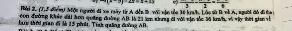 Thời gian đi từ `B` về `A` là `(x+21)/(36)` `(`giờ`)`
