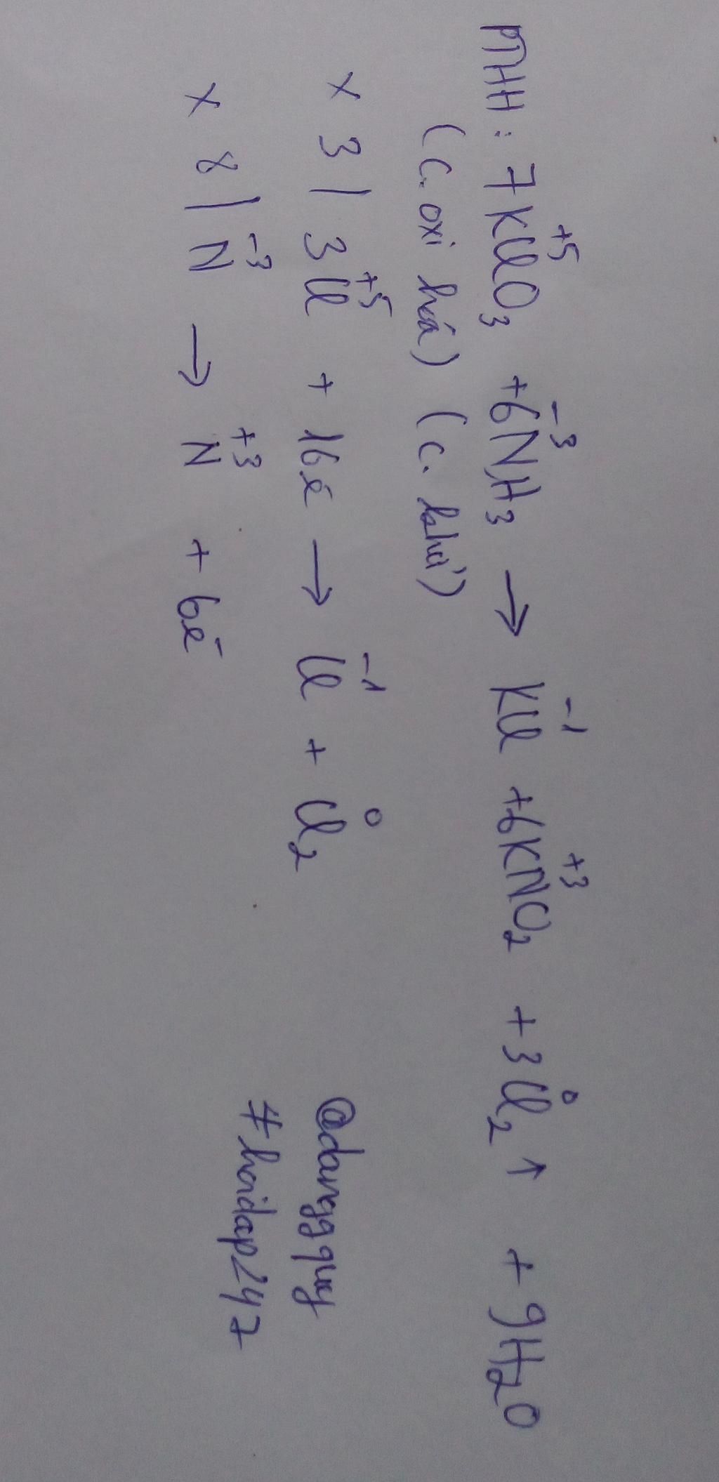 KClO3 + NH3 ---> KCl+ KNO2+Cl2 +H2O Cân bằng pt theo phương pháp thăng bằng e